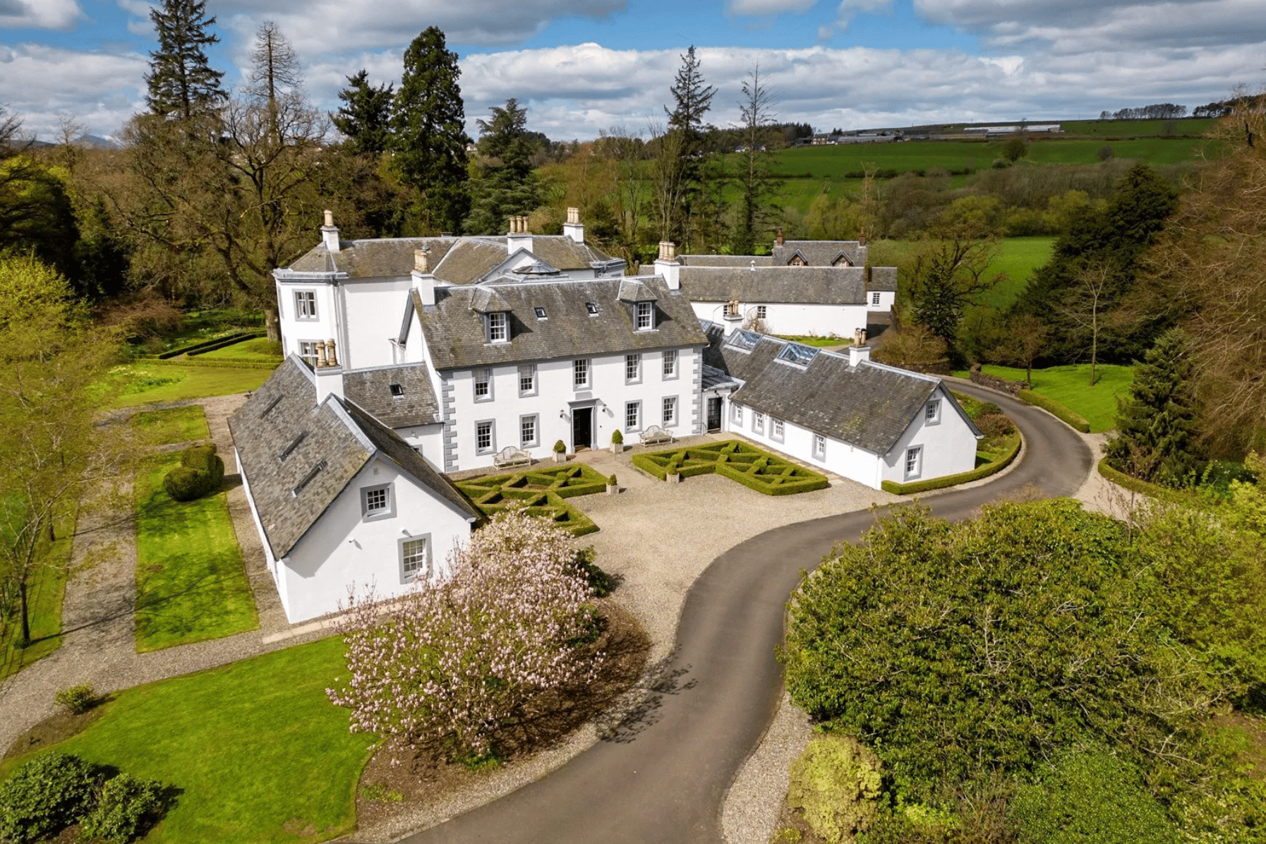 Outside, Behind secure automatic gates, the estate unfolds across more than 10 acres of lawned gardens, mature trees, terraces and private landscape. Outbuildings, cottages and historic ancillary space are arranged with thoughtful separation and cohesion, creating multiple usable zones within the estate.
