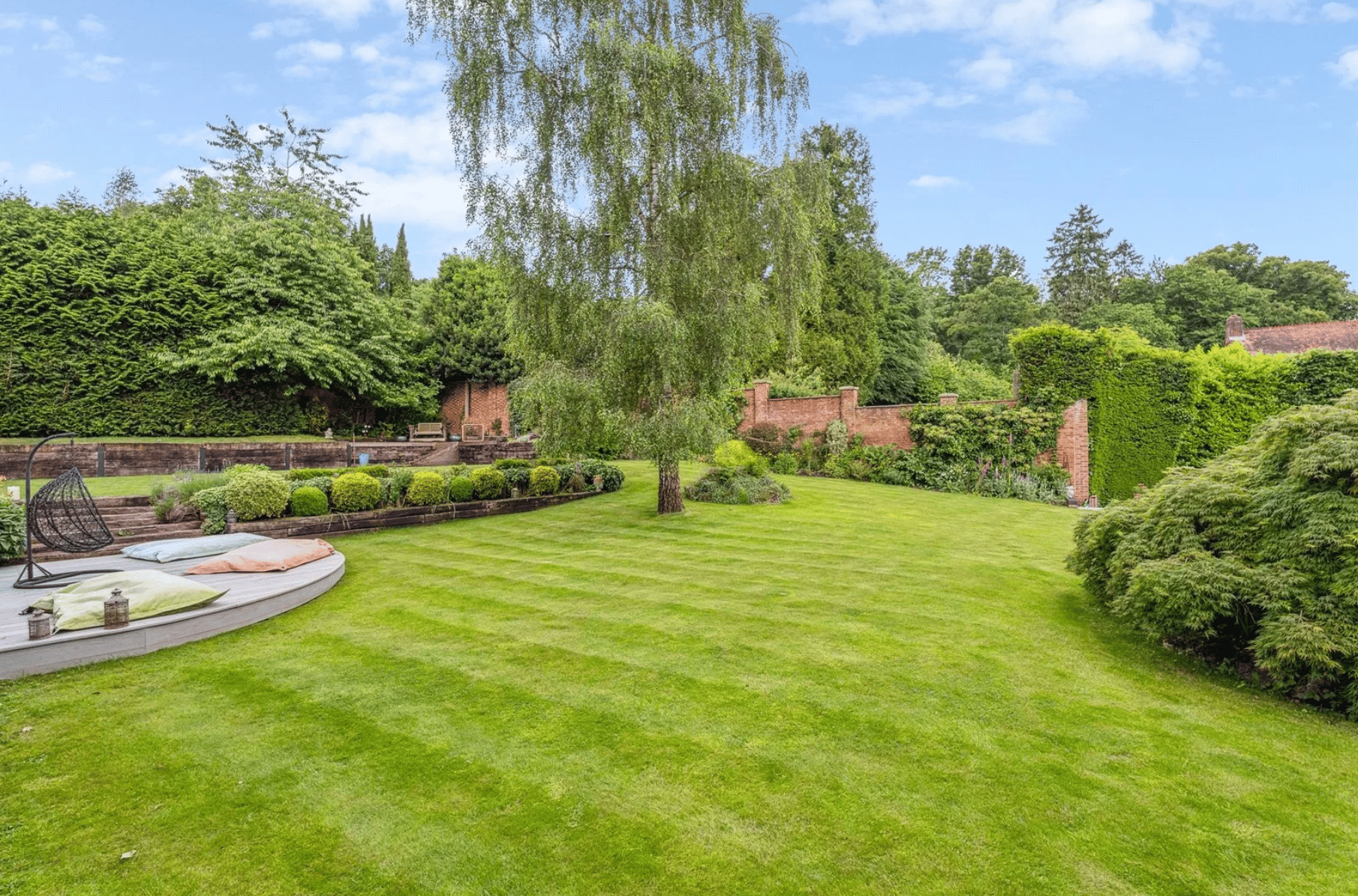 Outside, The gardens have been thoughtfully designed to balance formality with relaxed family living, featuring tiered lawns, mature planting, walled boundaries and generous stone terraces perfectly positioned for outdoor entertaining.