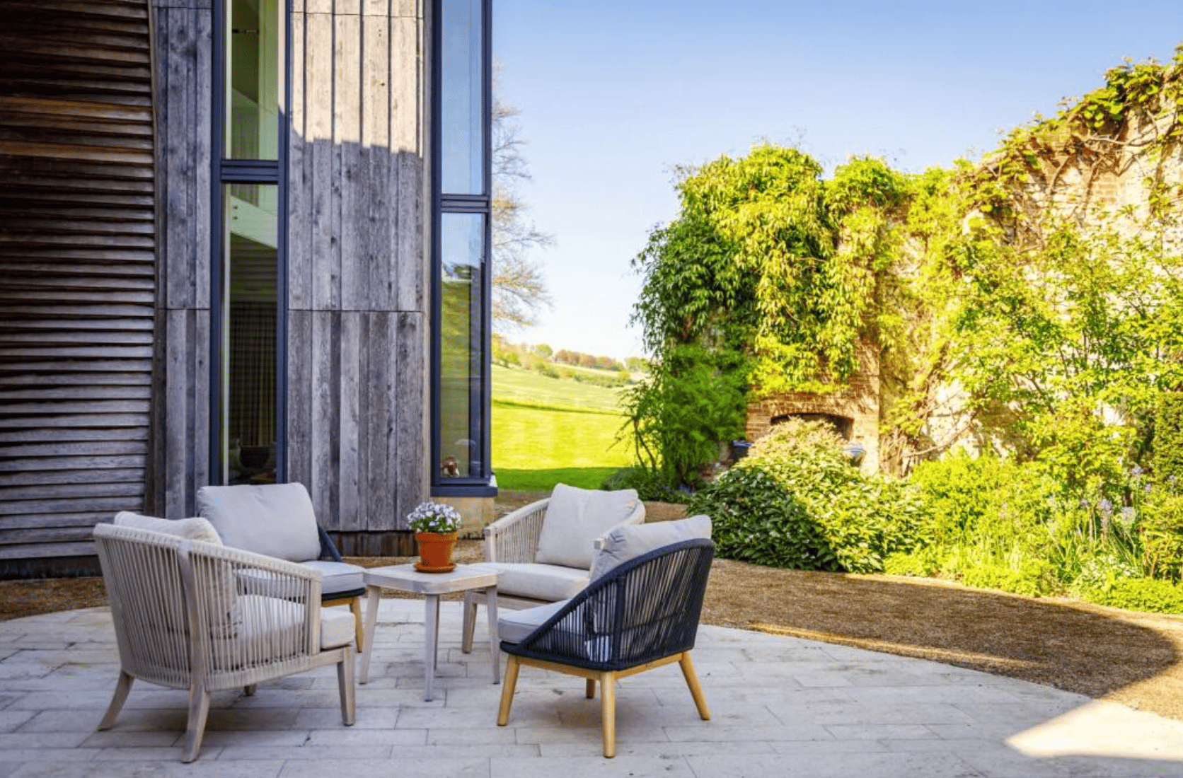Outside, the grounds unfold with sculpted lawns, wildflower meadows, mature planting and secluded terraces, creating a constant dialogue between architecture and nature.