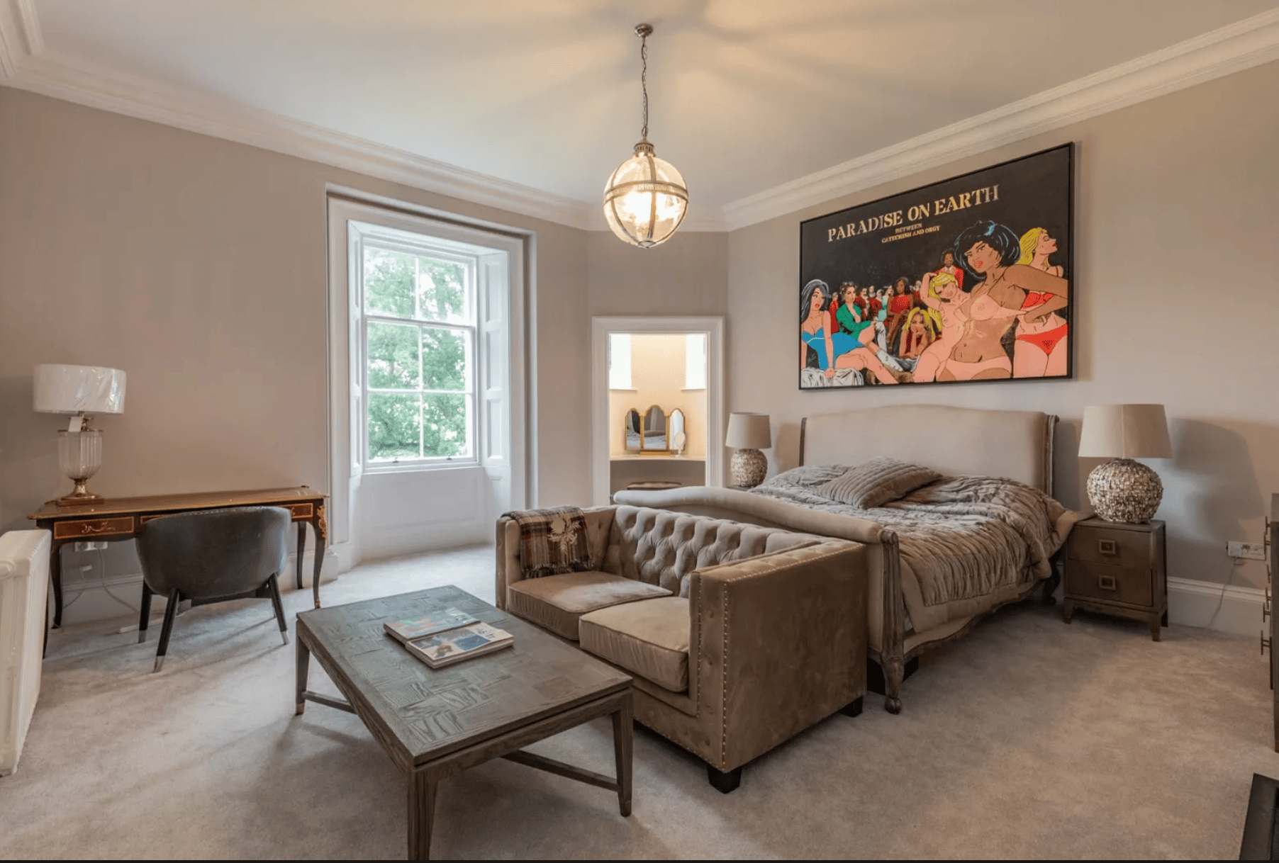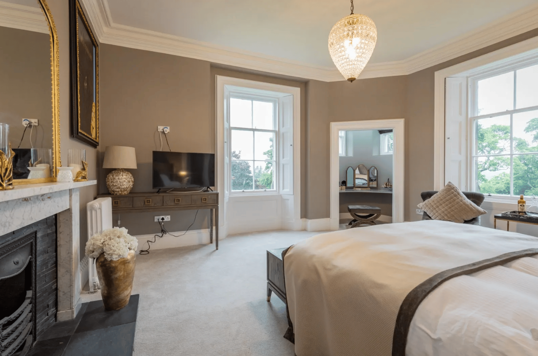 The accommodation includes eight principal bedroom suites, complemented by five enchanting tower rooms that offer panoramic views and a deeply romantic sense of castle living. The principal suite is particularly striking, featuring a turret, fireplace and spa style en suite with a freestanding bath.