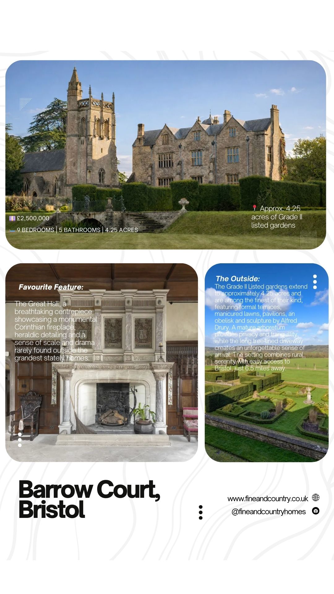 Outside, Set within approximately 4.25 acres of Grade II Listed gardens, the grounds at Barrow Court are as architecturally important as the house itself. Designed by renowned architect Francis Inigo Thomas, the gardens feature formal terraces, sweeping lawns, pavilions, an obelisk and sculpture by Alfred Drury. A mature arboretum provides privacy and tranquillity, while the long, tree-lined driveway creates an unforgettable approach.