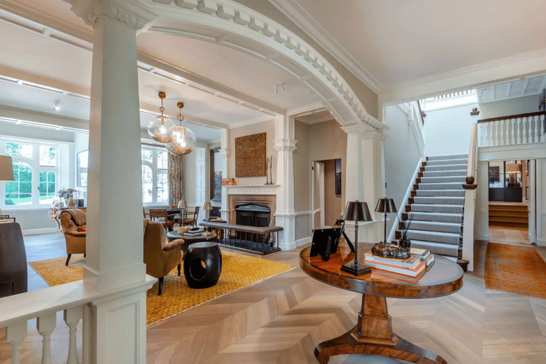 The sense of arrival is immediate. A magnificent 37ft reception hall, complete with open fireplace, sets a confident architectural tone and leads to a sequence of refined reception rooms including a drawing room, formal dining room and sun filled conservatory.