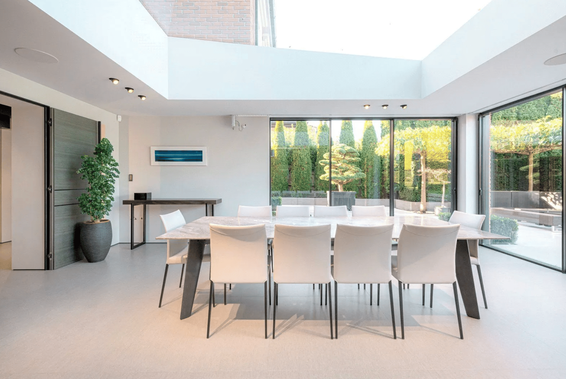 Inside, a grand entrance hall welcomes you with layers of natural light, setting the tone for the airy, contemporary design that unfolds throughout. The professional grade Poliform kitchen anchors the main living space, opening into a glass ceiling dining room that feels almost suspended within the garden.