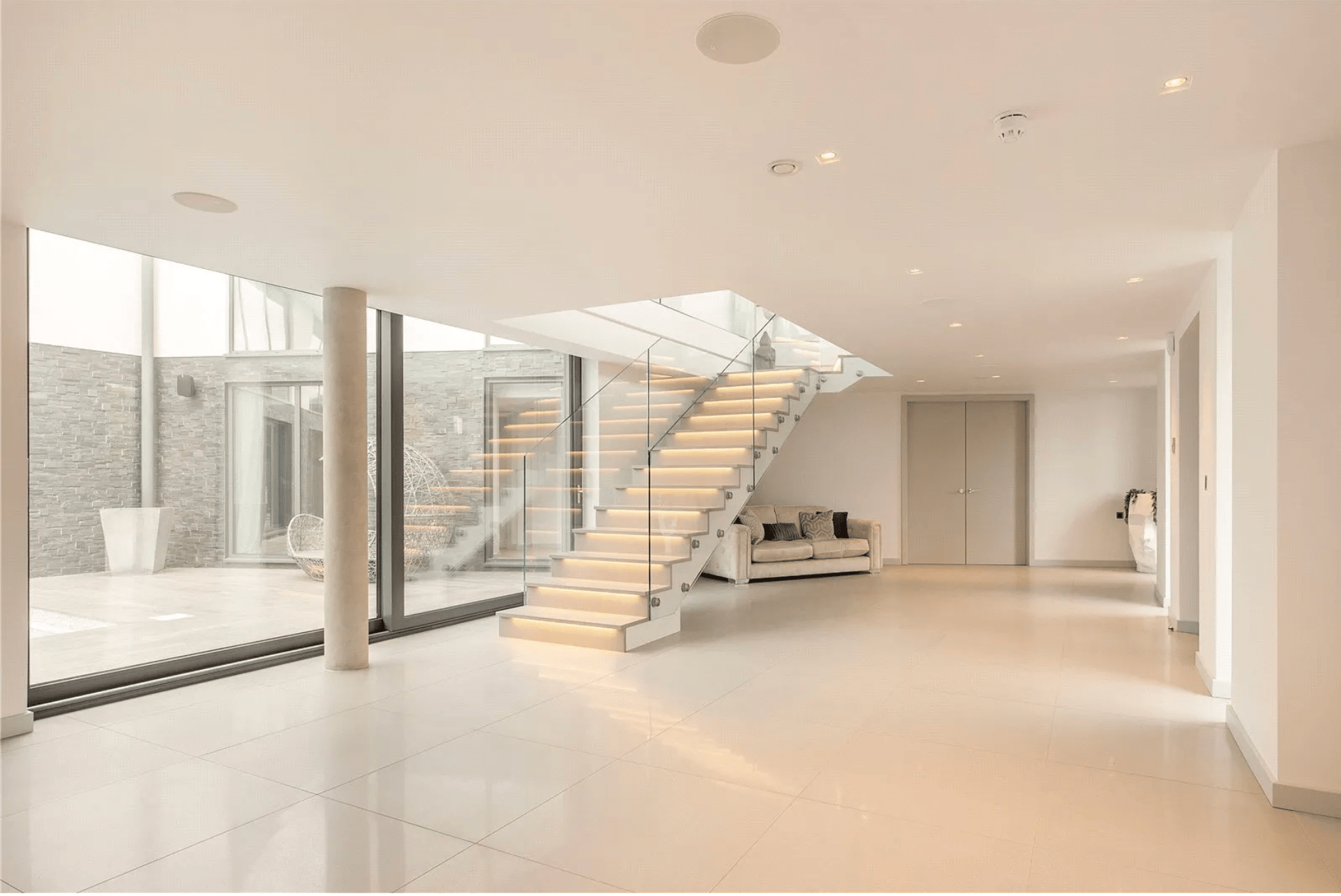 The sense of architectural drama is immediate. A statement entrance hall with a glass staircase and internal courtyard sets the tone, flooding the home with natural light and visual interest. The ground floor offers exceptional flexibility, with a guest suite, cinema room and study, ideal for both family living and hosting.