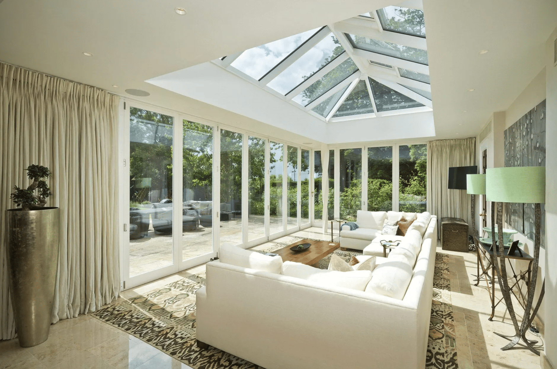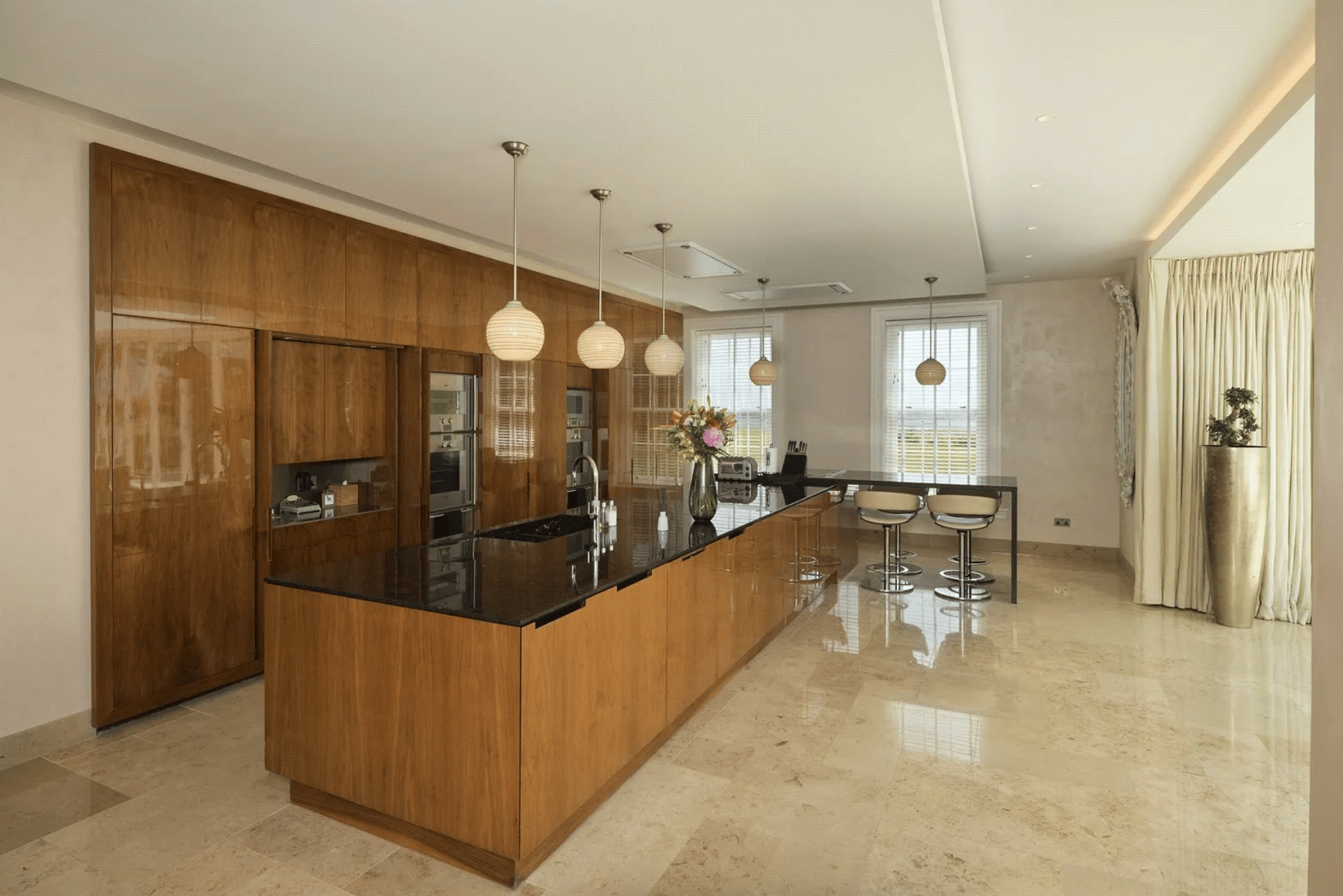 The heart of the home is a remarkable contemporary kitchen, while the adjoining orangery opens fully onto the terrace, allowing the house to flow effortlessly into the gardens.