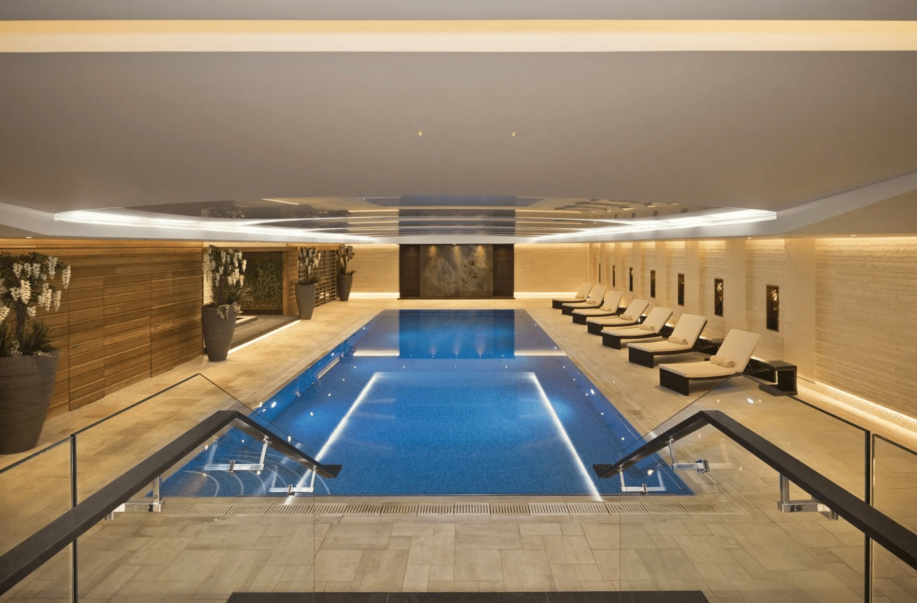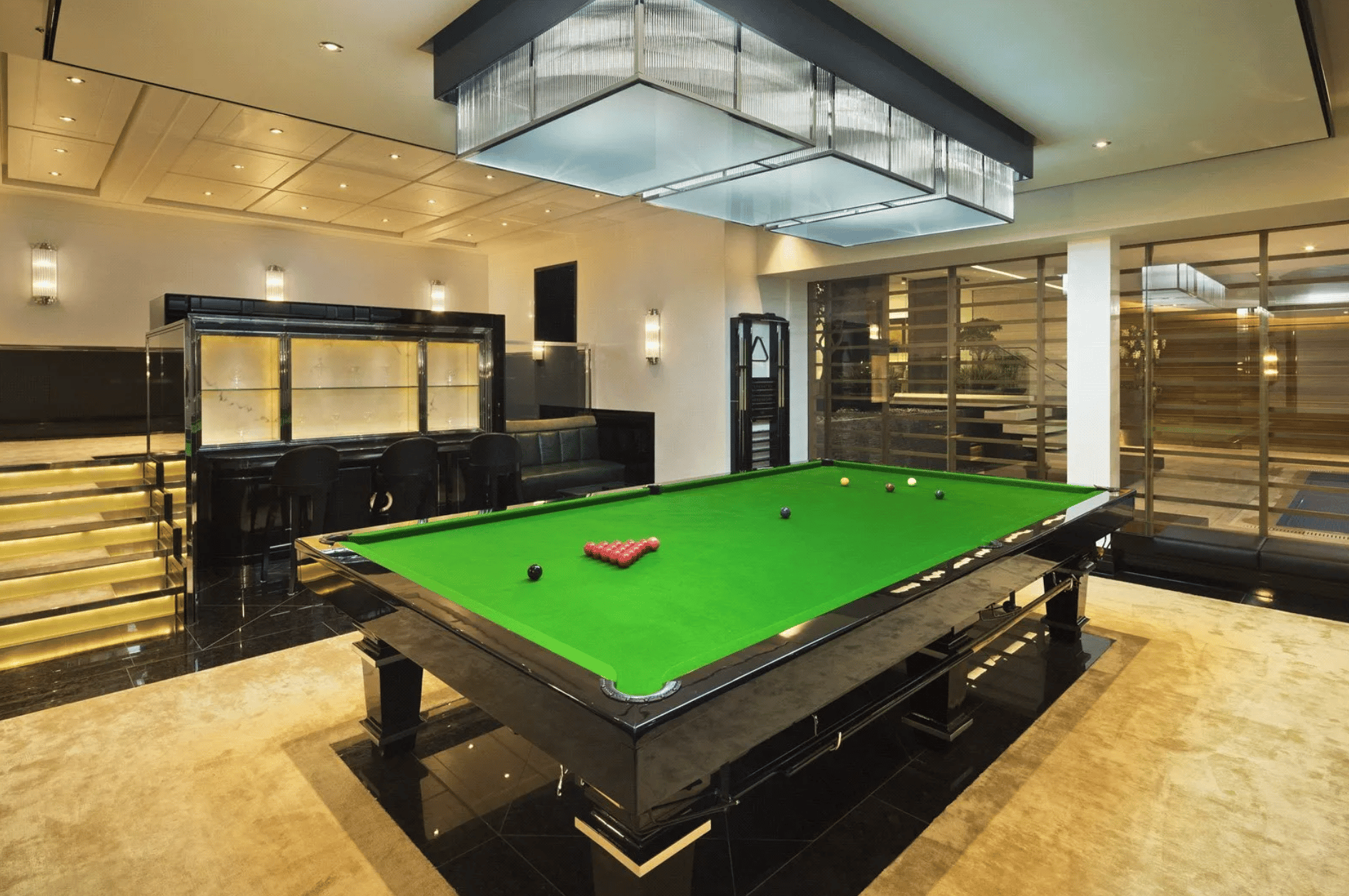 Located in the basement level, this luxurious private retreat centres around a 15 metre indoor swimming pool, surrounded by relaxation areas and a recessed hot tub. The suite also includes a fully equipped gym, snooker room, bar and temperature controlled wine cellar, creating the ultimate entertaining and wellness space within the home.