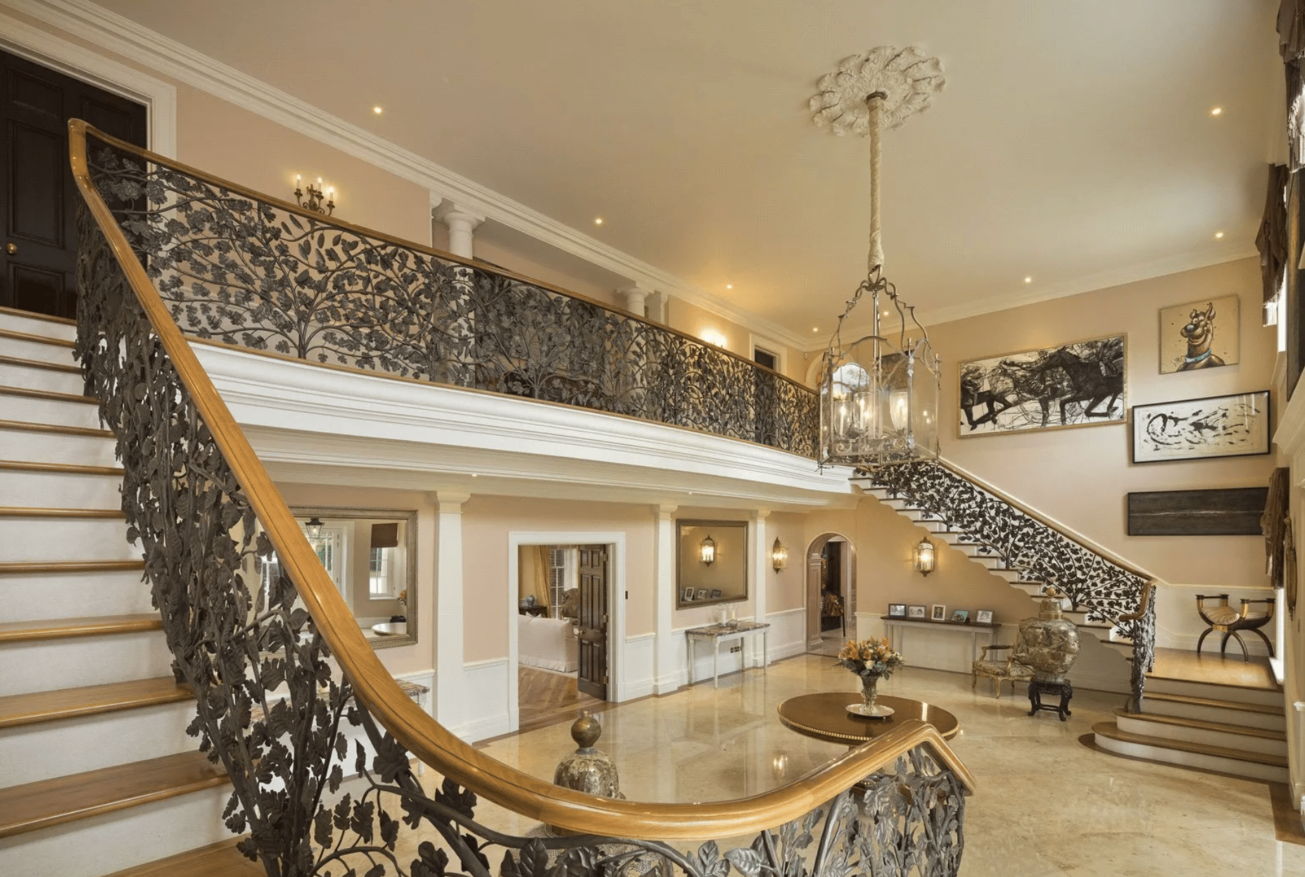 Step inside and the sense of scale is immediate. The reception hall is centred around a spectacular double flight cantilevered staircase with walnut treads, rising to a galleried landing above.